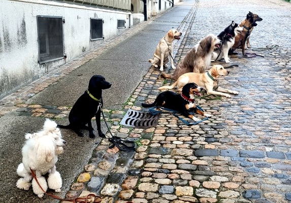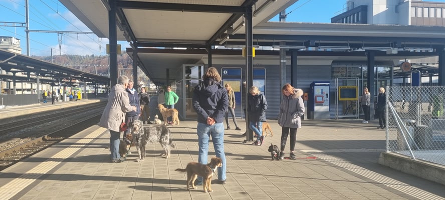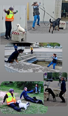 Es gibt Trainings in der Stadt ,im Wald , auf dem Hundeplatz.